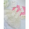 4-dielny set SISI vhodné pre rôzne oslavy a spoločenské udalosti i iné dôležité okamihy v živote dievčaťa. Set obsahuje: elegantné saténové šaty na krst krémovej farby, bavlnené body s dlhým rukávom, saténové capačky a bielu bavlnenú čelenku s mašľou.